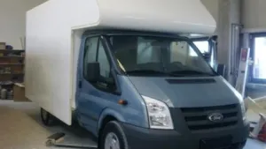 Ich hatte Euch versprochen, Bilder zu zeigen, wenn es etwas Neues gibt. Jetzt ist das Fahrzeug da und die Kabine ist im Rohbau drauf. Auf dem Bild fehlt noch der Türausschnitt. Er ist inzwischen auf der rechten Seite drin. Durch die Frontscheibe ist der Durchgang zwischen Fahrerhaus und Kabine zu sehen. die gesamte Rückwand und ein Teil des Daches sind entfernt, so daß ich jetzt mit meinen 1,90 m auch im an sich engen Transit-Führerhaus Platz habe. Als Nächstes kommen jetzt noch die Kanten, Türen, Fenster und Kofferklappen rein.
