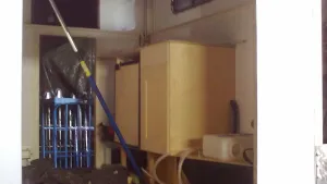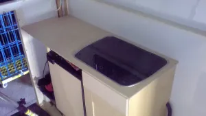 Gut Ding' will Weile haben... Aber besser spät als nie: hier sind die versprochenen Fotos (in der üblichen schlechten Qualität meines Fotohandies). Ich hoffe, Ihr könnt trotzdem die Einbausituation erkennen: der Kühlschrank steht mit seiner Rückwand press an der Kabinenwand, Kompressor und Kondensator sitzen oben seitlich auf dem Kühlschrank, rechts nebend dem Kondensator (der auch den Lüfter enthält) habe ich einen Ausschnitt in die Seitenwand gesägt, durch die die Kühlluft eigentlich zuströmen sollte. Das aber zeigt sich als zu knapp kalkuliert, da auch der Kondensator fast direkt an der Kabinenwand 'klebt'.