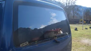 als erstes hab ich die scheibe in fahrtrichtung links, also über der küche gemacht. einfach links und rechts die stützgelenke abschrauben und fenster ganz nach oben klappen - dann aus der profilhalterung in der nach oben gehaltenen kippstellung nach unten herausnehmen. nun noch den mittleren hebel abschrauben und das fenster gründlich reinigen. jetzt sollten die 3 schraubstellen im fenster mit einem streifen klebeband abgeklebt werden, damit die schraublöcher keinen zugang für das seifenwasser zum scheibeninneren bieten. nun ähnlich wie bei der heckscheibe, folie grob zuschneiden, oberfläche seifenwässern, schutzfolie ab, folie drauf, wasser ausrakeln. die klebebandstellen ausschneiden, die ränder bündig abschneiden, wieder einbauen, fertig. hinten rechts dann fast das gleiche, da hier nur die 3 scheibenhalterungen ab und das fenster so raus kann. beim schiebefenster den griff runterschrauben, dann das bewegliche element folieren. letzte und für mich bisher kompromissbehaftete variante: das feste element im schiebefenster. die scheibe ist am rand stark gewölbt auslaufend. hier hab ich die folie exakt auf das vorstehende mittelteil geschnitten (43,5x33,5cm) und die ränder um ein glas herum rund zugeschnitten. dann hab ich nur das mittelteil foliert. sieht von aussen gut aus - man sieht nicht, das der kleine aussenbereich nicht foliert ist. nur von innen "irritiert" der noch klare rand....