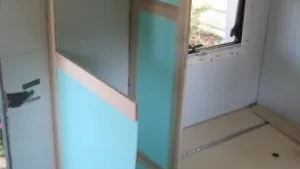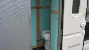 Die Nasszelle soll als Ein- und Durchgang dienen wobei die innere Tür in Normalstellung die Toilette verdecken soll und um 180°schwenkbar ist, die ist als Kompromiss an die Bodenlänge von 2,55m nötig.