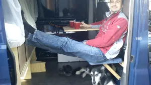 mir gefällt Deine Idee und die Umsetzung sehr gut. Ich plane auch (besser gesagt die Planung ist fertig) ein AllroundWoMo. Auf ein LR 130 Fahrgestell kommt eine 2,8 x 2 m große Schachtelhubkabine. Die herausnehmbaren Möbeleinbauten werden nur links und rechts sein. Dazwischen bleibt soviel Platz, dass auch mit Möbel mindestens eine Europalette eingeladen werden kann. Dazu werden hinten auch zwei große Türen angebracht. Die Zeichnungen sind nicht mehr ganz aktuell, aber das Prinzip ist ersichtlich. Das Regal links wird schmaler und kürzer. Der Sitz in der Mitte kommt an die Seite. Eine Platte vom Bett bekommt Klappbeine um sie auch im Freien als Tisch verwenden zu können. Da mein derzeitiger Arbeitsvertrag noch bis juni 2013 geht und ich wahrscheinlich nochmal bis 2015 verlängere, ist der Baubeginn Januar 2015.