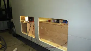 Fenster (Glasschiebefenster, isolierverglast) und Klappen sind eingebaut, außer der Klappe vom Kofferraum, da bin ich mir über die Plazierung noch nicht ganz im Klaren.