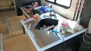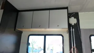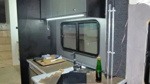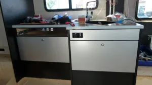 Mit den "Rohbauarbeiten" im Innenraum bin ich weitgehend fertig, es fehlen nur noch die Oberschränke über den Sitzbänken und die Verkleidung der Sitzbänke. Der Teppiochboden wird erst ganz am Ende verlegt, deshalb sehen mache Bauteile auch noch etwas roh aus. Die Elektroarbeiten sind auch weitgehend abgeschlossen, lediglich der Sicherungskasten und die Anzeigeinstrumente über der Eingangstür müssen noch anschlossen werden, aber das wird kein großer Akt mehr. Bis jetzt hat alles ganz gut funktioniert, lediglich die Wasserinstallation hat mich einige Nerven gekostet.
