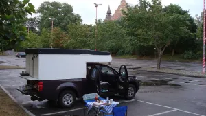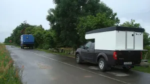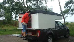 Sämtliche Wände, das Dach und auch der Boden, der 1,7 x1,9m mißt und sich völlig frei über die Ladefläche spannt(!), bestehen aus diesen Platten. Zwischen dem Dach und der Rumpfkabine befindet sich ein Stoffbalg mit Fenstern und Lüftungsmöglichkeiten. Außen sind die Platten vorlackiert ind innen mit MAWITex beklebt, wegen "Wohlfühlklima". Alle weiteren Einbauten, wie "Schränke" und Sitze sind ebenfalls aus MonoPan gefertigt und mit der Rumpf-Kabine verschweißt. Am 12.07.2011 16.45 Uhr legte unsere Fähre in Travemünde ab und es folgten knapp 3 Wochen Skandinavien-Urlaub. Nach ca. 5500 km und fast jedem Tag mit typisch skandinavischem Wetter hatte unsere neue Kabine die erste, aber nicht letzte Bewährungsprobe für diesen "Sommer" mit Bravour bestanden. Keinerlei Ermüdungserscheinungen oder gar Risse an irgendwelchen Verbindungen oder Schweißnähten zu erkennen. Kabine innen absolut trocken, nicht einmal in der Nacht gefroren, trotz Temperaturen, die sehr oft nur im einstelligen Bereich lagen, es manche Nacht nicht nur geregnet, sondern geschüttet hat, und wir nur mit dünnen Steppdecken geschlafen haben. Die zweite Bewährungsprobe war dann Anfang/Mitte August zur HanseSail. Erst Sturm mit Böhen bis WS 12, dann Dauerregen bei WS 5-6 mit kurzzeitigen Aufheiterungen, die aber kaum zum Trocknen der Segelklamotten reichten. Fazit nach ca. 10.000 zurückgelegten Kilometern: Ich würde wieder zu diesen Platten greifen! Leicht, lassen sich mit etwas handwerklichem Geschick relativ problemlos verarbeiten, extrem stabil, Preis ist vertretbar, Wärme- bzw. Kälteisolierung spielt bei "Nur-Frühjahr/Sommer-Einsatz" keine Rolle, in einer Hubdach-Kabine mit Zeltbalg sowieso nicht. Die hier einmal angesprochene Brennbarkeit ist mir durchaus bewußt, doch wir sind weder Raucher noch anderweitig fahrlässige Kokler und gekocht wird bei uns prinzipiel im Freien. Fotos werden demnächst noch folgen.