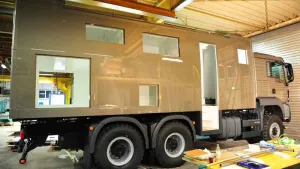 Unser Mounty steht seit einer guten Woche bei einem befreundeten LKW Lackierer und bekommt seine Farbe ab. Ich habe diese Arbeiten "Gottseidank" einem Profi überlassen, es ist enorm wie hoch der Aufwand ist um eine saubere Oberfläche Innen und Aussen zu realisieren. Und ich dachte ich hab schon gut vorgearbeitet :oops: .