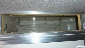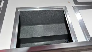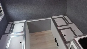 Staukästen an die Seiten, welche dann auch gleichzeitig die Sitzbänke werden sollen. Schränke in Kopfhöhe