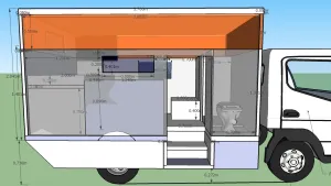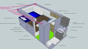 Klo: Die Türe soll in beide Richtungen aufgehen. (Eventuell) Auch so, dass man das Klo (nur das Klo) zumachen kann und die Dusche offen bleibt. Damit hat man wieder die Kabine verlängert (sogar bis ins Fahrerhaus)