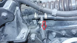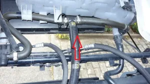 Links vom Motor bevor es zum Wärmetauscher des Fahrerhauses geht und vorn danach, vor dem Ausgleichsbehälter.