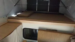 Um ehrlich zu sein, war es eher eine teilausgebaute Kabine. Details gibt es bei http://www.fourwheelcampers.com/index.php/products/shell-model/. Es ist ein Hawk mit einer Bodenlänge von 2m. Bereits drin waren: LED Innenbeleuchtung, 2 Außenlampen, ausziehbares Bett (2mx2m) mit Polstern und Kabel für Solaranlage (mal sehen, ob ich Solar wirklich brauche). Es ist eine Hubdachkabine mit einer Dachgröße von ca. 3,20m x 2m. Der Zeltbalg ist aus stabiler LKW Plane mit einer zusätzlichen ausknöpfbaren Innenisolierung ("Arcticpack"). Im Balg sind 4 große Fenster 4 lagig ( Mückengitter, zu öffnende Klarsichtfolie, Verdunklung, Isolierung).Angehoben wird das Dach ganz einfach von Hand, normalerweise sogar ohne Gasdruckdämpfer. Das geht erstaunlich problemlos, aber da ich häufig noch ein Kanu transportiere, habe ich mir als Extra Gasdruckdämpfer geleistet. Die Kabine ist als Aluskelett gebaut und wiegt ohne Einrichtung 320 kg.