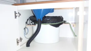 Als Eimer habe ich einen 15kg Eimer aus dem Malerbedarf genommen. Mit einem Expander dann an einem Zwischenboden-Brett befestigt. Der Lüfter ist hinten links oben zu sehen. Es handelt sich um einen BeQuiet BL061 ohne PWM. Die Geschwindigkeit kann ich so über eine kleinen DC Konverter regeln, den ich sowieso wegen 24V Bordspannung benötige. So ist der Lüfter nicht zu hören bzw. extrem leise. Allerdings muss er schon die ganze Zeit laufen, da sich sonst die Gerüche verbreiten. Lediglich beim Fahren entsteht wohl ein Sog am Lüftungsrohr, der den Geruch abzieht. Das funktioniert komischerweise besser wie mit Lüfter.