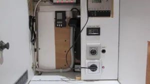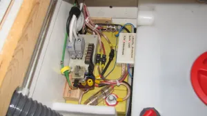 Oben im Schrank sieht man den Balancer. Der Luftstrom kommt von rechts (Abluft Kühlschrank) und geht nach links weg.