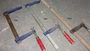 Die Zwingen sind in Profi Qualität, aber nich mehr ganz frisch wie auf dem Bild zu sehen. Man sieht, das sie lange nicht gebraucht wurden. Verschieben geht aber problemlos und mit etwas Stahlwolle geht auch der Flugrost ab. Ein Manko will ich aber nicht verschweigen: das Gewinde ist nicht mehr auf ganzer Länge OK. Das letzte Viertel ist teilweise beschädigt. Macht aber im Gebrauch keinen großen Abbruch.
