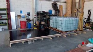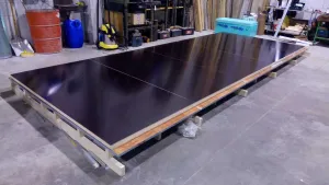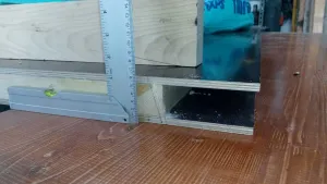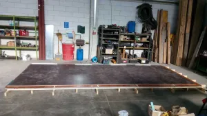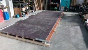 Und zwar habe ich mit dem Schreiner all die nötigen Siebdruck Platten für die Bodenplatte aufs Mass geschnitten. Weil wir aber seine Säge nicht so ganz in den rechten Winkel eingestellt haben könnt ihr euch vorstellen das die Kanten jetzt nicht gerade geworden sind. So musste ich jede nächste Platte so versetzen das ich eine ungefähr gerade Linie zu Stande gebracht habe.