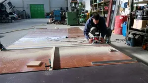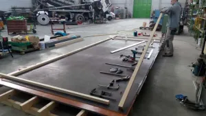 Nun, der Presstisch hat nun sechs Längsstreben bekommen die so verteilt sind das ich die Platten mit Paletten 100x120 pressen werden kann. In die Schallungsplatten habe ich an den Verbindungspunkten der Siebdruckplatten Kanale eingefrässt, so dass sich der aufschäumende Kleber nicht zwischen Siebdruck- u. Schallungsplatte verschmiert. Hat sich später als gute Idee bewiesen.