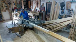 So. Habe heute mit dem Schreiner alle restlichen Nuten gemacht (Wände u. Dach). Aufs Mass werde ich die Siebdruckplatten später selber schneiden. Auch die Ausfachung wurde für alle Wände zugeschnitten und gehobelt... ...mensch war das eine staubige Angelegenheit... ![]()