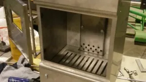 Bei diesem Bild sieht man die neuen Scharniere (Typ 115), das aufs neue passende Mass beschnittene Türblatt sowie den neu aufgeklebten V2A Rahmen am Klappenrahmen.