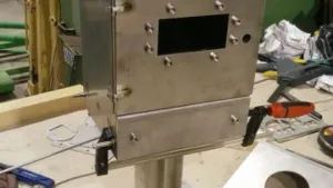 Was mir bei dieser Geschichte viel Zeit geraubt hat waren die Überlegungen wie ich die Scharniere festschraube das ich nicht wieder vor dem Problem Feuchtigkeit und offene Strinseite der Siebdruckplatte stehe. Denn die Schrauben würden vermutlich genau dies wieder tun...