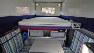 Dazu habt Ihr 2,59 x 1,57 cm Bodenfläche und 76 cm Höhe vom Pritschenboden bis zur Oberkante Dach Fahrerkabine zur Verfügung. Die Dachbreite oben verjüngt sich auf 140 cm.