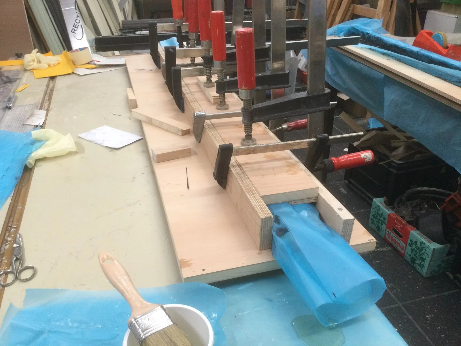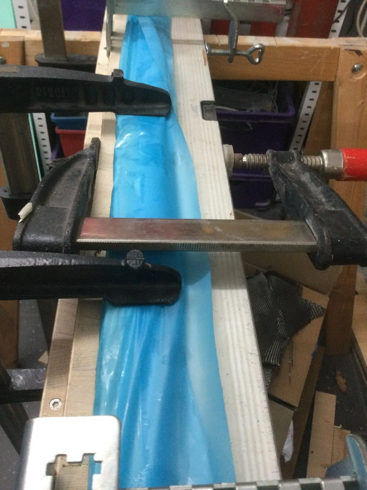 Nach einer Stunde kann man die Schraubzwingen noch einmal nachziehen. Übermorgen, nach mindestens 35 bis 48 Stunden ist das Harz so fest, dass man das Ergebnis auspacken kann. Wir sind gespannt...
