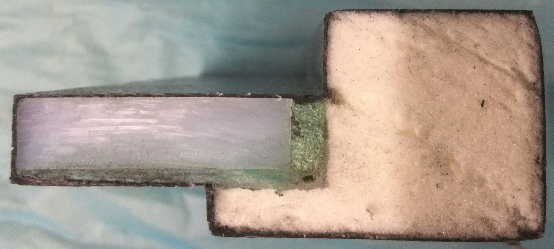 Die Trennfolie wird mit dem GFK-Paket in die Form gelegt und der Schaumstoffstreifen in die Vertiefung der Form gedrückt. Dabei muss man darauf achten, dass genug und nicht zuviel Material bis an die obere Kante der Form reicht.