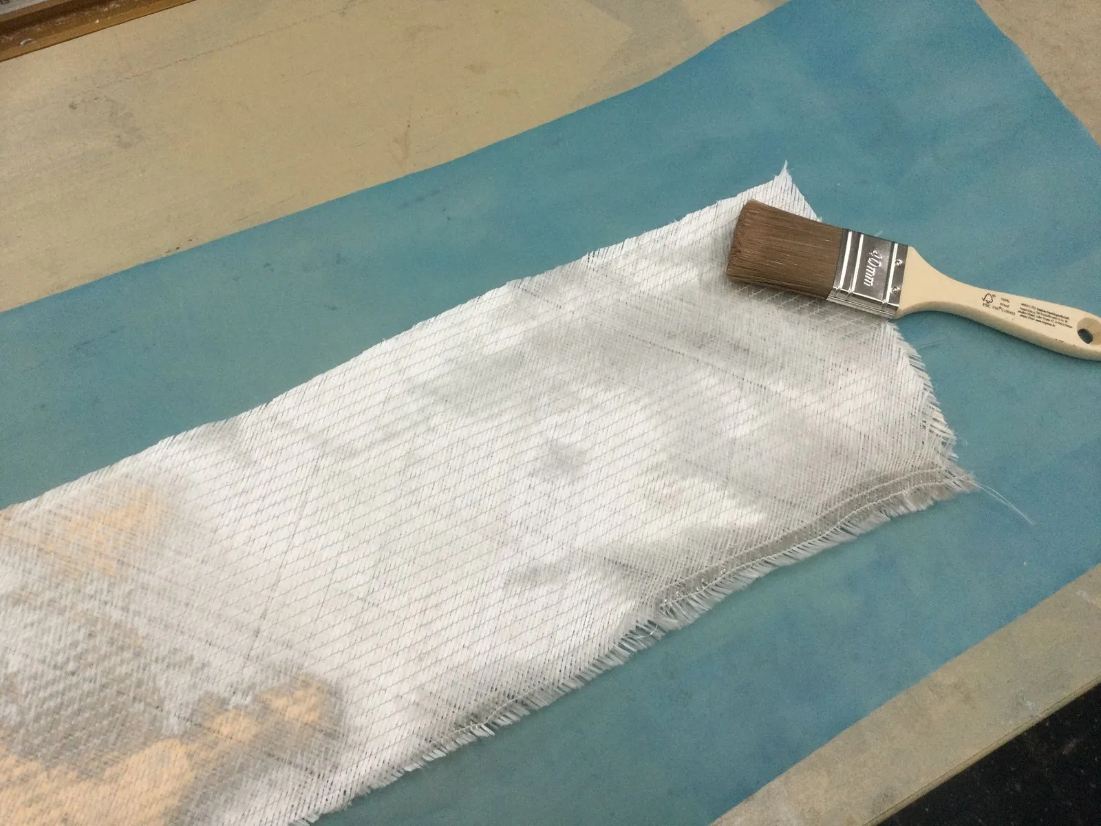 Mit einem nicht zu teuren Pinsel wurde Epoxidharz mit einer Topfzeit von 4 Stunden satt aufgepinselt. Als Unterlage dient eine Trennfolie, die später mit in die Form kommt. Die Glasfaser zeigt mit der Transparenz im Gegensatz zu Kohlefaser die Sättigung mit Harz.