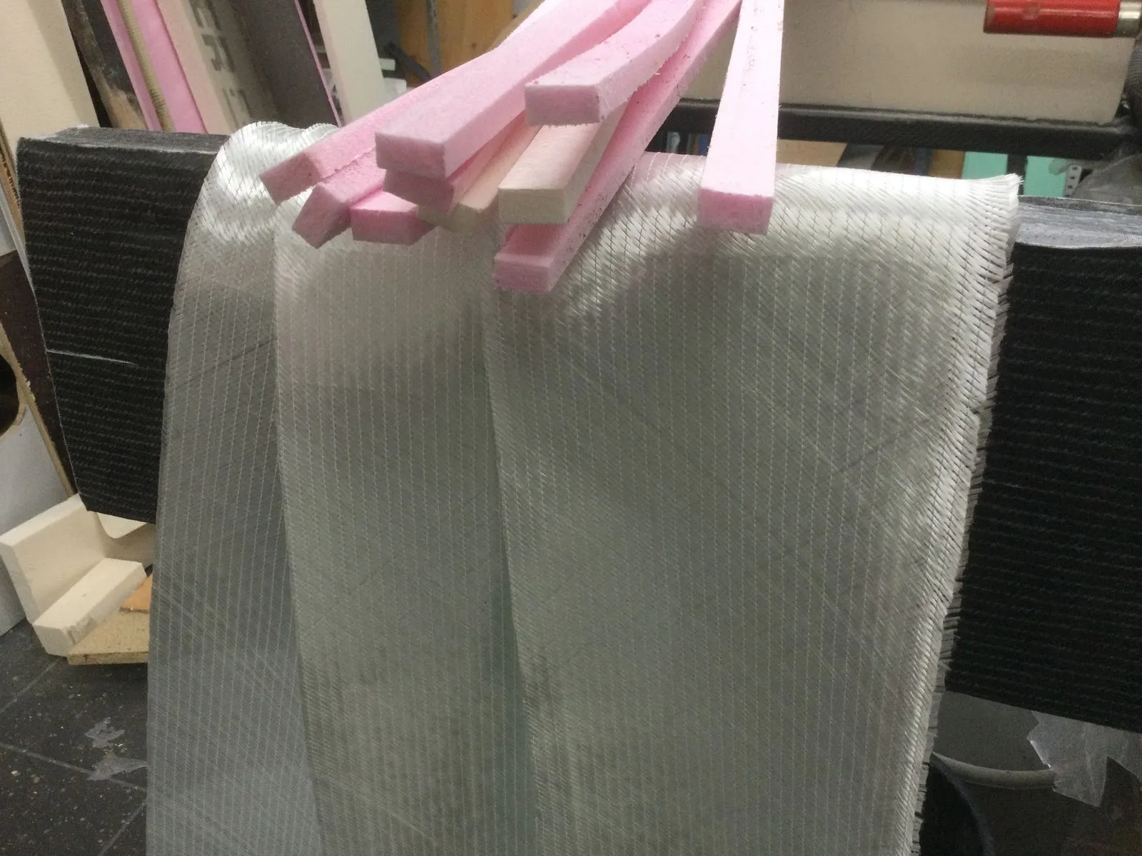 Die gespendeten Glasfasermatten wurden in Streifen zu 16 cm geschnitten, benötigt werden 14 cm. Die Fasermatten wurden doppelt gelegt und die Dicke gemessen, für 2,5mm braucht man hier 7 Lagen. Auch bei der Länge wurden 10 cm hinzugegeben. Für mich als CFK-Fan war es eine ganz neue Erfahrung, dass man Markierungen mit einem Stift sehen kann. Auch die Formstücke, die später einlaminiert werden, wurden alle schon einmal aus Styrodur-ähnlichem Schaumstoff gesägt, leicht übermassig, da komprimierbar.