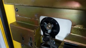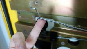 Mach ma die grosse schwarze plastikabdeckung innen an der schiebetüre runter. Wahrscheinlich ist das gestänge ausgehakt.