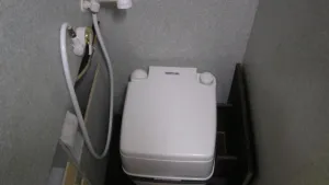 Beide Abwasserschläuche (Küche und Toilette) führen oben in den Tank mit 55 Liter: