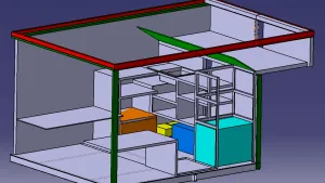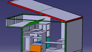 Der Grundgedanke ist ja bekannt. Die Maße bleiben bei LxBxH: 3100x2050x1600, mit 50mm Alu-Sandwich. Das dunkel blaue ist der 80l Wassertank, Hellblau Engels Kühlbox, Orange Truma Combi E, Gelb zwei Batterien, und daneben die Wasserpumpe. Und da daneben der Gaskasten mit Innenmaße TxBxH 400x350x650. Das Hubdach kann man dann vorne hoch klappen, dadurch kann ich nicht überall senkrecht stehen, aber zumindest mal im vorderen Wohnbereich. Hinten dann die zweite Sitzgelegenheit die man zum Bett umrüsten kann. Die Regale werden aus 30x30 Profilen.