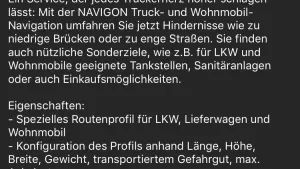 Hab mich vor einiger Zeit etwas mit den ganzen Android-Navi-Apps herumgeschlagen. War unter anderem auch mit den LKW-Versionen unterwegs (gab es von den meisten Anbietern als 7 bis 14-Tage Testversion). Mein Fazit: ich bin wieder von den LKW-Versionen komplett weggekommen, genau aus dem Grund wie ihn Herby genannt hat. Auf Strecken die ich kenne wurde ich fast Ausnahmslos auf die grossen Transitstrecken geschickt, obwohl es von den Massen und Gewichten auch alternativen gibt. So wurde ich, mit meinen knapp 5 Tonnen, nicht auf die 18-tonnen beschränkten Strasse sondern auf der längeren Umfahrung davon geschickt. Oder auf schnellste Routenführung gestellt und ich wurde über die Landstrasse (mit max 80 km/h) geführt statt auf der minimal längeren Autostrasse, wo ich mit dem Womo, im Gegensatz zum LKW für den Warentransport, hätte 100 fahren dürfen und das der Navi-App auch so mitgeteillt hatte.