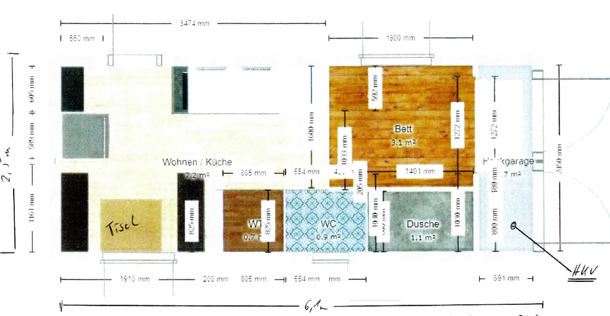 die Bodenplatte wird innen und aussen je 9mm Siebdruckplatte, zwischen drin 40mm XPS Schaum als Isolation. Bodenbelag wird ein Eichenparkett.