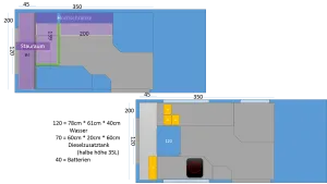4.1 vorher hatten wir einen 50L Tank IM Fahrzeug. Das haben wir auf 12L geschrumpft und dafür Wasserflaschen mitgenommen. Abwasser unter dem Auto - kommt auch wieder!