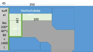 4.3 Stauraum: Unter dem Bett (1/3 unter 2/3 ist der Motor), unter Sitzbänke, in 2x halbhohe Schränke, in einer Küchenzeile und in einer großen Luke über Fahrerhaus: Manko war eigentlich nur, dass mir die Trennung von Werkzeug / Außenbedarf wie Stecker, nicht außerhalb gelagert werden konnten. Zusätzlich eine 100L Blechkiste draußen gehabt, welche Jedoch mit 1x 20L 1x 15L und 1x5L Benzin gefüllt war. Sowie Gaskocher, Stühle, Tisch. Vorzelt war im Fahrzeug.