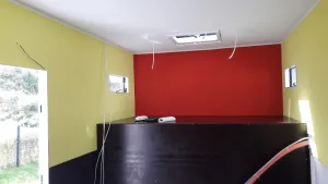 Vliestapeten sind, wo bisher sinnvoll, an Wand- und Decke verklebt und Latexfarbe ist aufgebracht und durchgetrocknet.