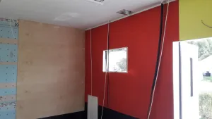Dann die Multiplexplatten mit Spezialkleister für Vliestapeten eingerollt und sofort die Vliestapete trocken an die gekleisterte Wand gehängt.