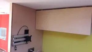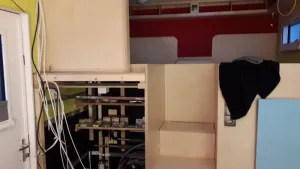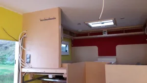 Die Trennwand ist komplettiert, mit TV-Halter, Garderobe und kompletter Elektrik.