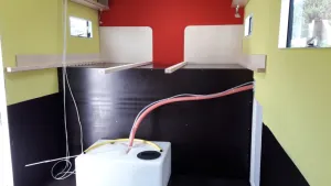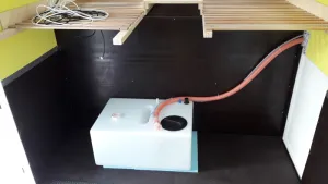 - Die Wasserpumpe hat auch ihren Platz gefunden.Als nächstes wird das Schrank-Innenleben (links) fertiggestellt. Der von außen zugängliche Stauraum (rechts) ist nahezu fertig. Es fehlen noch ein paar Regalböden.