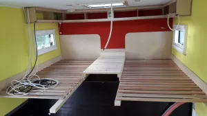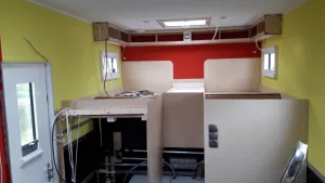 Außerdem haben neben den Dachfenstern auch die ersten Seitenfenster jetzt Rollos.Jetzt geht es konkret an den Wassertank, die Wasserpumpe und die Schränke unter den Betten.