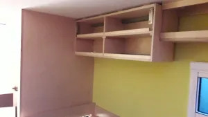 der Schrank ist 35 cm hoch und 25 cm tief. Rechts daneben sieht man ist ein offenes Regal. Diese Regale sind um den kompletten Kopfbereich der Betten herumgebaut.