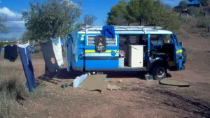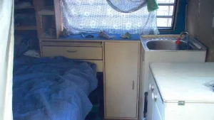 Das 2. Womo,ein von mir aus-umgebauter Eiswagen, nach dem mir der 1.beim schweissen des letzten Bodenlochs ausgebrannt war :oops: Er war entkernt,bis auf den Fahrersitz,dem wurde leider viel zu heiss.