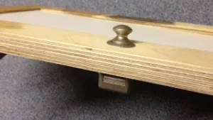 Die Klappe ist 59x29 cm groß und wiegt ohne Beschläge 1,2 kg. Mit Standard-Möbelbauplatten wäre Sie minimal schwerer, nämlich 1,3 kg. Klingt banal, sind aber 8% Unterschied.