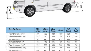 Ich habe auch noch eine Tabelle mit den Höhenwerten des Luftfahrwerks angehängt. Bei mir ist die höhere Variante verbaut. Zusätzlich habe wir gestren noch mal das Ganze auf der Autobahn gefilmt, allerding hat das Video 121 MB, da müsste ich eventuell eine Dropbox einrichten und es dort einstellen.