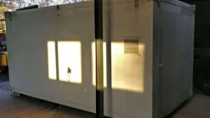 Der Shelter hat Containerecken und außen am Boden Alukufen (wie die BW-Shelter).