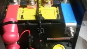 Die Klebebinder werden verschraubt oder mit Polymer Kleber fixiert. Am Pluspol ist eine Hauptsicherung . Die Alukisten sind Kunstoffpulverbeschichtet. Das Kabel ist eine Kurzschlussfeste verzinnte Sondergummileitung mit richtigen DIN Kabelschuhen von klauke .