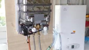 Ich kenne den Unterschied zwischen Boiler und Durchlauferhitzer. Es war ein Durchlauferhitzer, der in einem gekapselten Gehäuse saß. Frischluft über einen Wandanschluss und Dachkamin.