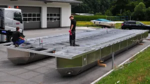 Mobilix: die Schwimmer bleiben leer bis auf das begehbare Abteil für das Bugstrahlruder, viel luftdichte Luft gegen das Sinken und 12 m³ Platz für Wasserballast :!: