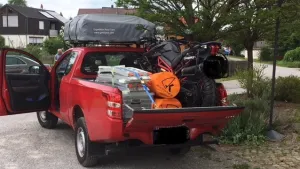 Der primäre Schlafbereich ist das Gordigear. In der Kabine möchte ich Sitzplätze (keine Stehhöhe), Vorratschränke, Heizung und Notküche. Heizung Diesel. Kochen Spiritus zweiflammig. Kein Gas. Toilette. Außendusche. PV auf dem Dach. Dynamische Dachlast von 80kg auf der Kabine muss drin sein (fürs Segelboot, das sind die zwei orangen Taschen auf dem Pickup). Kein Durchstieg (Dachzelt ist quer auf dem Fahrerhaus und öffnet nach rechts, Vorzelt dran bei Bedarf).