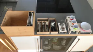 Die kleine Küchenzeile hat jetzt ein Innenleben mit drei herausnehmbaren Kästen (Bambus) bekommen.