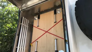 Der Tisch passt zusammengeklappt gut in den Heckstaukasten.