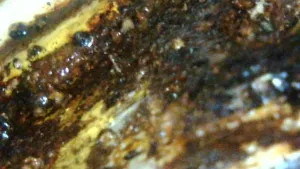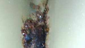 Ich denke damit habe ich die Quelle für das Rostwasser gefunden. Von außen ist keine Stelle zu sehen, durch die das Wasser hätte kommen können. Ich vermute dass sich tatsächlich Kondenswasser in den Lücken, die auf dem Bild zu sehen sind, gesammelt hat. Das würde auch die abgerostete Antenne erklären, die in einer dieser Lücken verschraubt war. nach dem lösen der Antenne lief auch nochmal etwas Wasser nach.